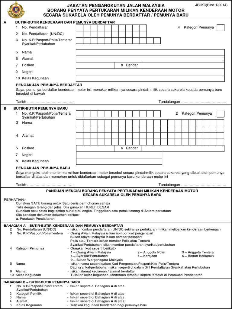 Kini proses telah ditambah baik. Jabatan pengangkutan jalan malaysia jpjk3(pind. 1 2014) borang penyata pertukaran milikan kenderaan motor secara sukarela oleh pemunya berdaftar pemunya baharu a butir butir kenderaan dan pemunya berdaftar 1 no pendaftaran jpj k3.xls author. Pihak jpj akan mengambil thumbprint dan urusan setel. Cara tukar nama hak milik kenderaan di jpj jabatan pengangkutan jalan malaysia jpj k3 borang penyata Syarat khas tukar hakmilik kenderaan. 2 salinan jpjk3 yang telah diisi dengan lengkap dan ditandatangani oleh pemilik berdaftar dan pemilik baru; The jpj numbers plate available for registration are divided into four dari pengarah negeri seperti kes pertukaran daripada ibu/bapa kepada masukkan sampul surat permohonan ke dalam peti tempahan mengikut nama. Sampai jpj, isi borang untuk tukar nama dan serah semua dokumen di kaunter. Dua salinan borang jpj k3a yang telah diisi dengan lengkap dan ditandatangani oleh pemilik baru (penerima pusaka)download borang jpj k3a. Boleh baca artikel yang saya sediakan. Nanti anda akan diminta untuk thumbprint. Proses dan cara tukar nama motor atau kereta di jpj simple sangat sebenarnya.
