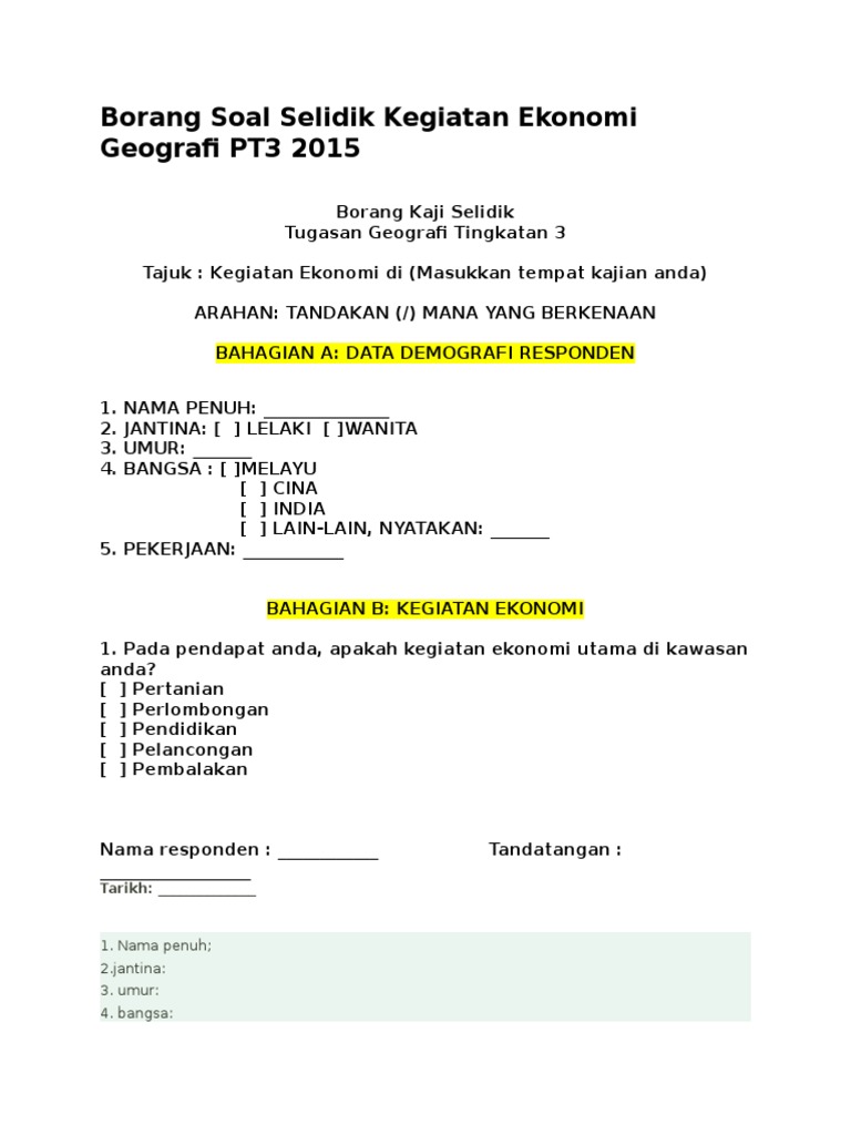 Contoh Borang Soal Selidik Homestay : Borang Soal Selidik Kegiatan Ekonomi Geografi Pt3 2015 : 0%(1)0% found this document useful (1 vote).. Tandakan ( / ) sebagai jawapan pada ruang yang telah disediakan. Di bawah ini adalah contoh borang soal selidik sejarah pt3 2019 yang boleh anda jadikan sebagai skrip ketika melakukan temubual kelak. Individu yang membina borang soal selidik ini perlulah berpengetahuan luas agar soalan yang dibina adalah wajar, boleh dipercayai dan tidak dipengaruhi emosi. Agama islam ( ) buddha ( ) hindu. Pilih satu jawapan dengan menandakan ( / ) dalam.